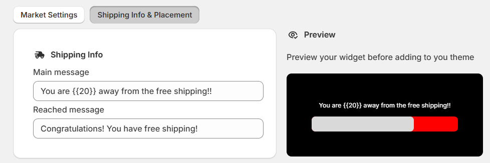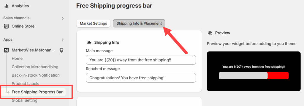 To do so, go to Free Shipping Progress Bar from the app admin and select the Shipping Info & Placement tab.