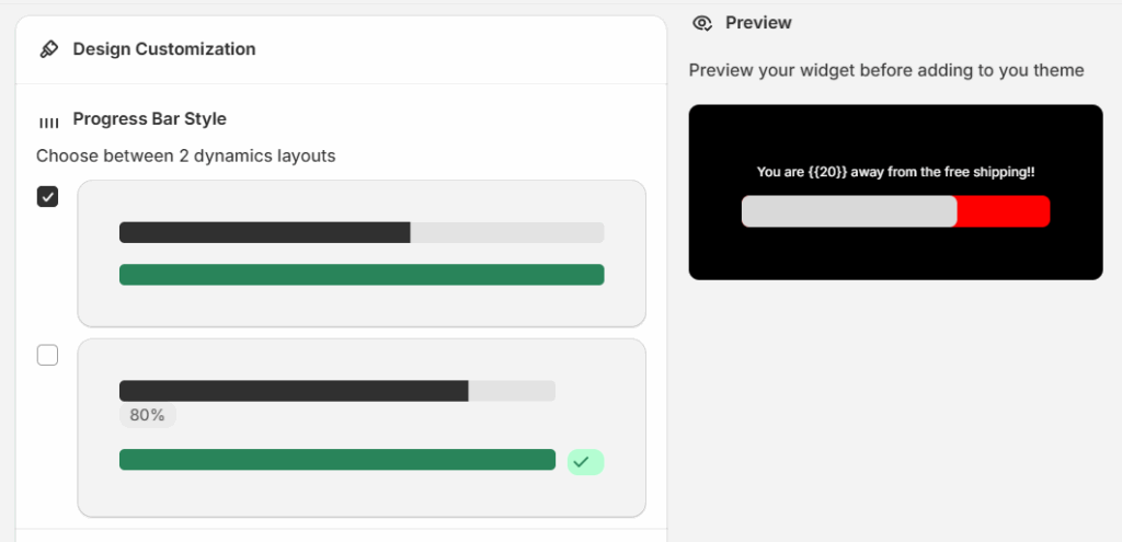Under Design Customization, you’ll find two layout options for the progress bar. These define how the free shipping goal is visually displayed to customers.