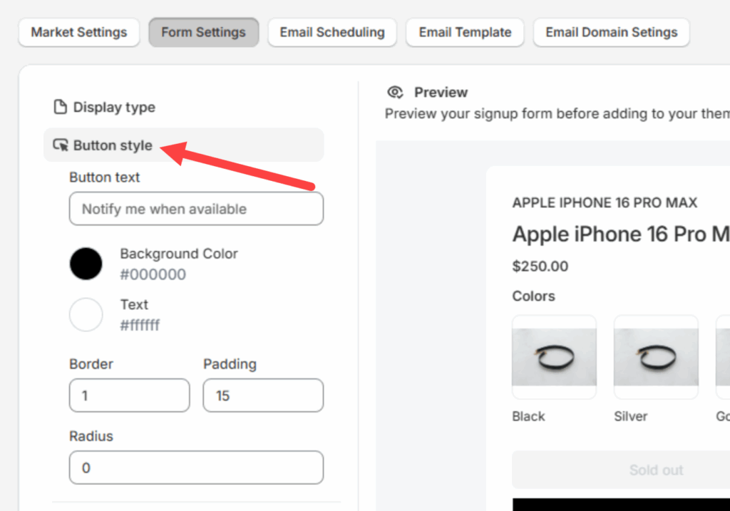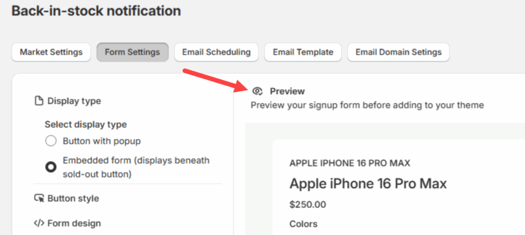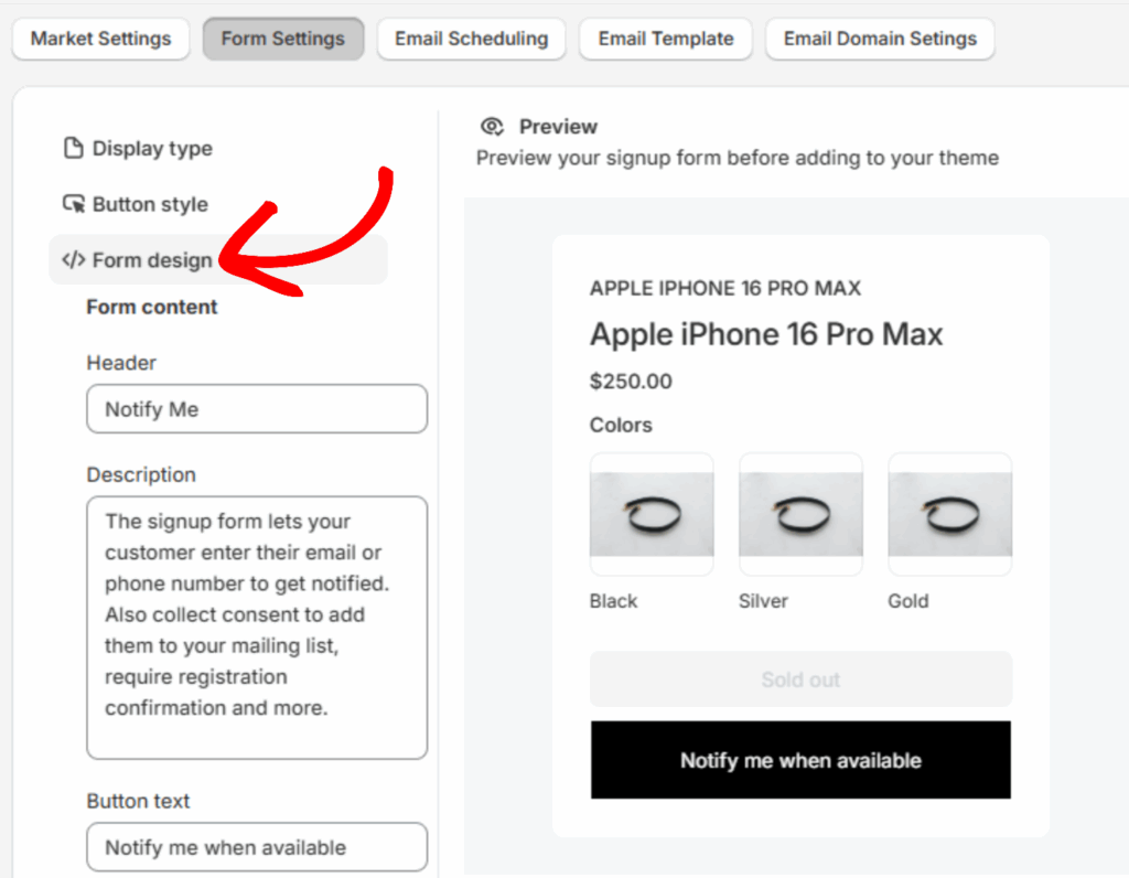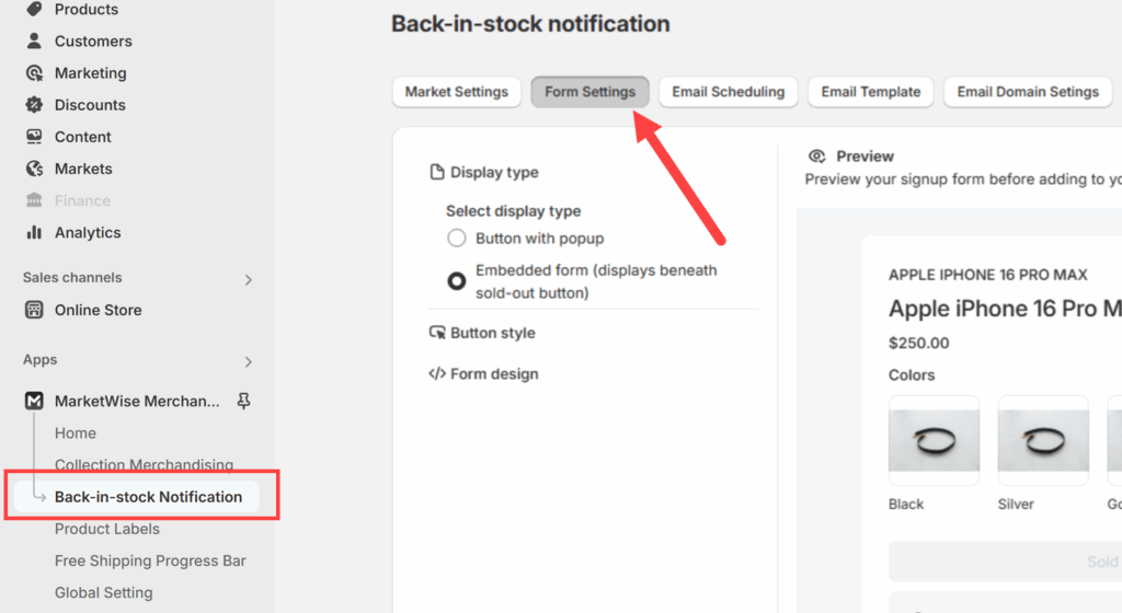 To do so, go to Back-in-stock Notification and then click the Form Settings tab from above.