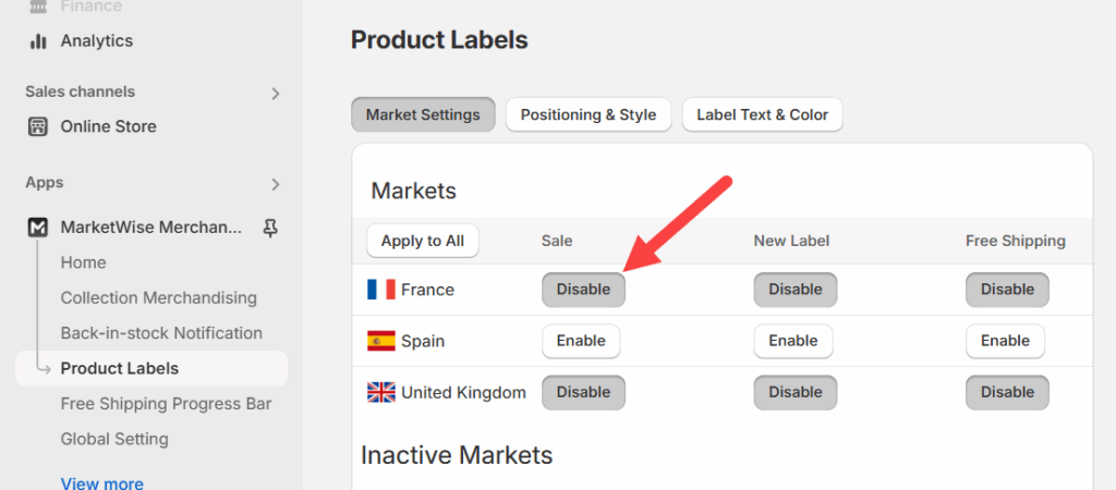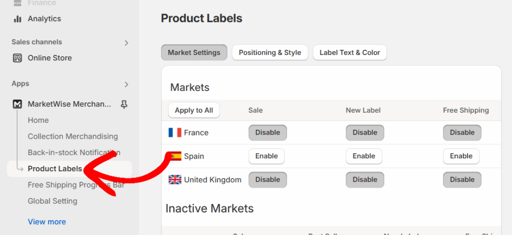 Product Labels let you highlight key promotions on your products by adding tags like Sale, Best Seller, New, and Free Shipping. You can choose which labels to enable for each market individually.
