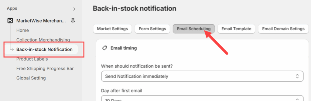 To configure the timing, go to Back-in-stock Notifications and click on the Email Scheduling tab.