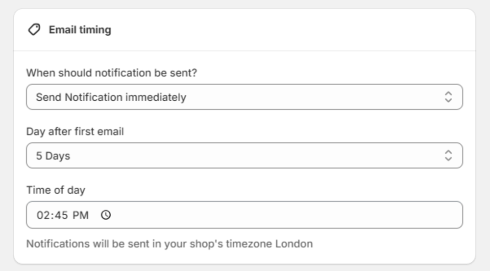 In the Time of day field, choose when the emails should be sent. Emails are scheduled based on your store’s timezone, which is displayed below the field.